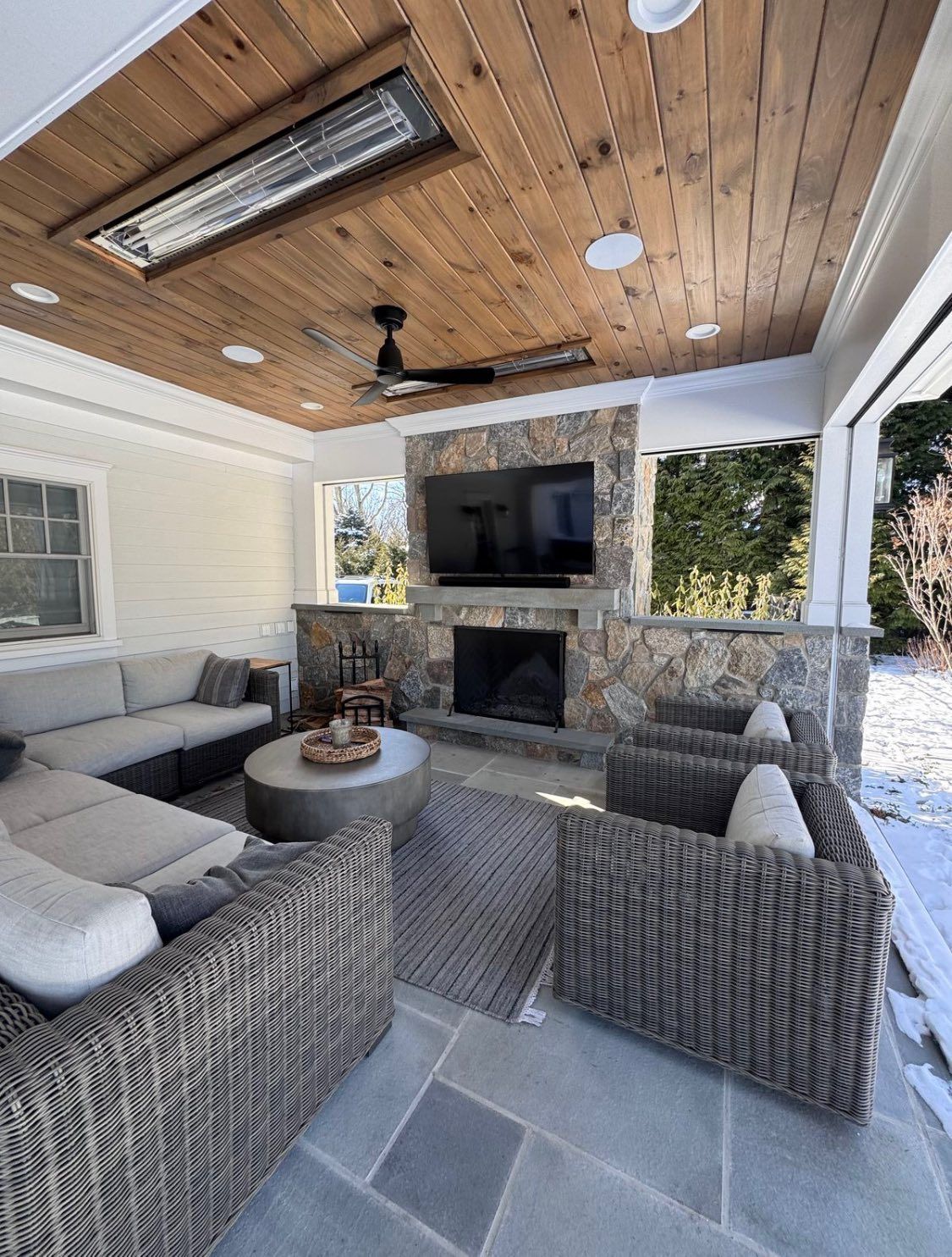 The crew grades the area to slope away from covered zones and installs drainage channels or French drains where needed. This prevents standing water and keeps the space usable after heavy rain.